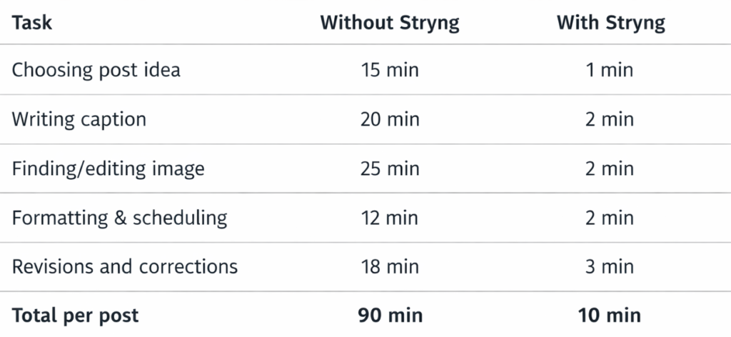 Stryng handles the repetitive mechanics of content production. The store owner stays involved, but without rebuilding the workflow each week.