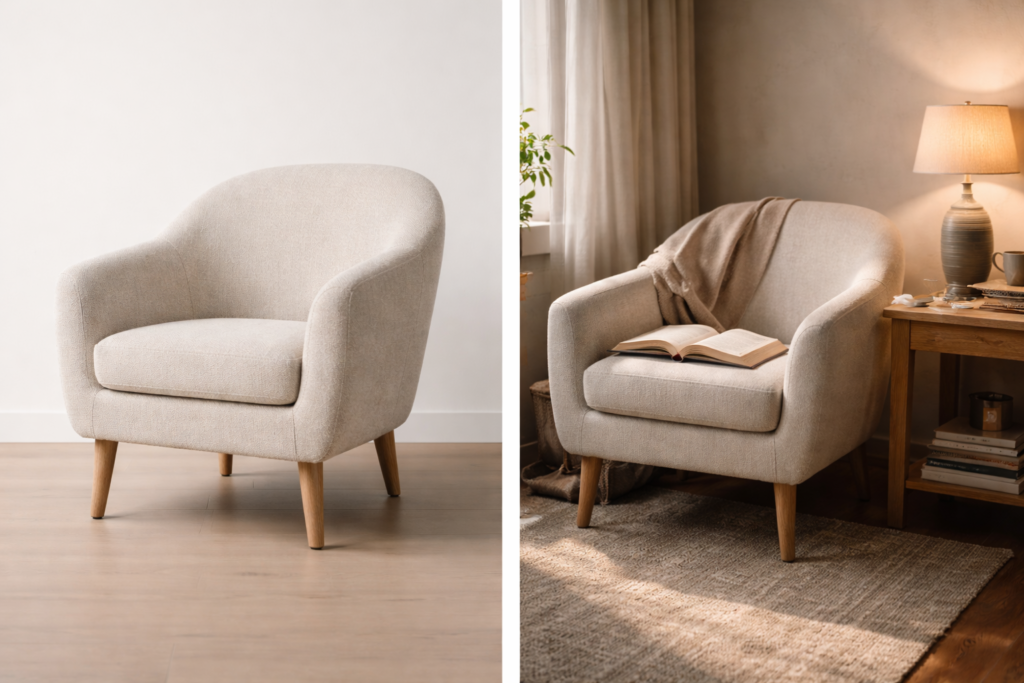 Instead of a plain image of a chair, show a small reading corner with soft light and a book on the seat. Instead of a simple photo of a skincare product, show a morning routine.
