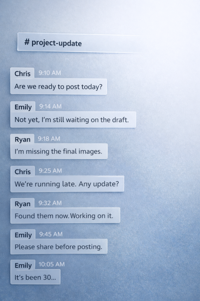 You answer questions, clarify details, revise captions, look for missing files and check schedules. You notice that one post uses last season’s product image, and send another message to fix it. None of this is dramatic, but it repeats and takes space in your head.